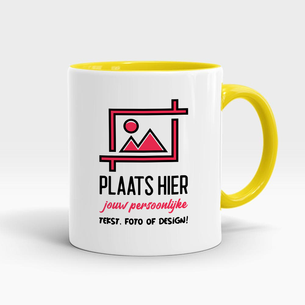 Bedrukte mok lichtgeel. Door de leuke kleur accenten is dit mok een perfect geschenk. Pas hem aan met jou eigen foto, logo of tekst.