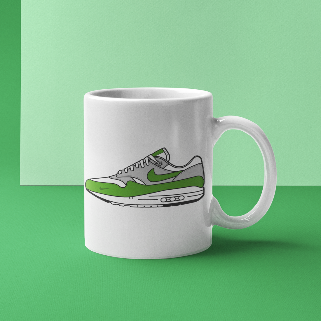 Unieke Air Max 1 Chlorophyll koffie mok. Deze onwijs populaire AM1 nu exclusief op je eigen mok. Zo begin je elke dag je ochtend een stuk beter!