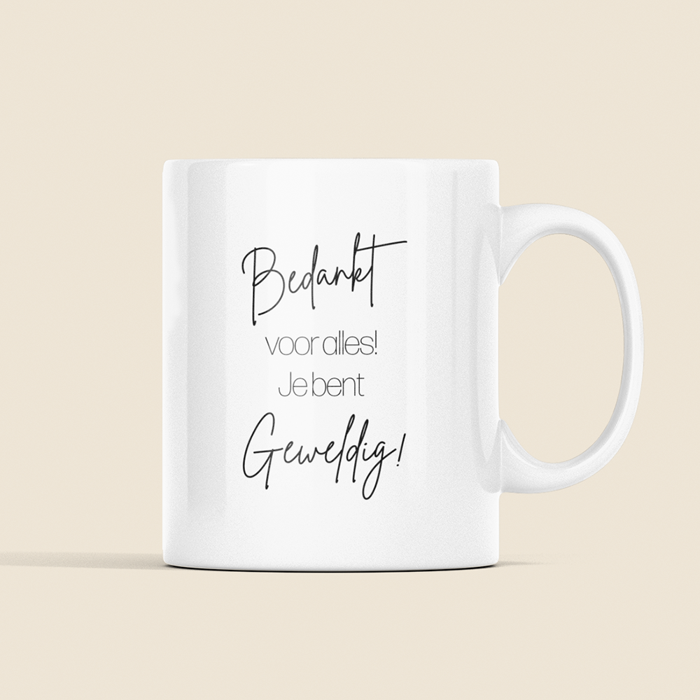 Of het nu gaat om een vriend, familielid, collega of mentor, deze mok is het perfecte cadeau om je dankbaarheid te tonen en hen eraan te herinneren hoe speciaal ze voor je zijn. Voeg een persoonlijk tintje toe aan je geschenk met deze simpele maar betekenisvolle mok – een perfect gebaar van dankbaarheid voor elke gelegenheid.